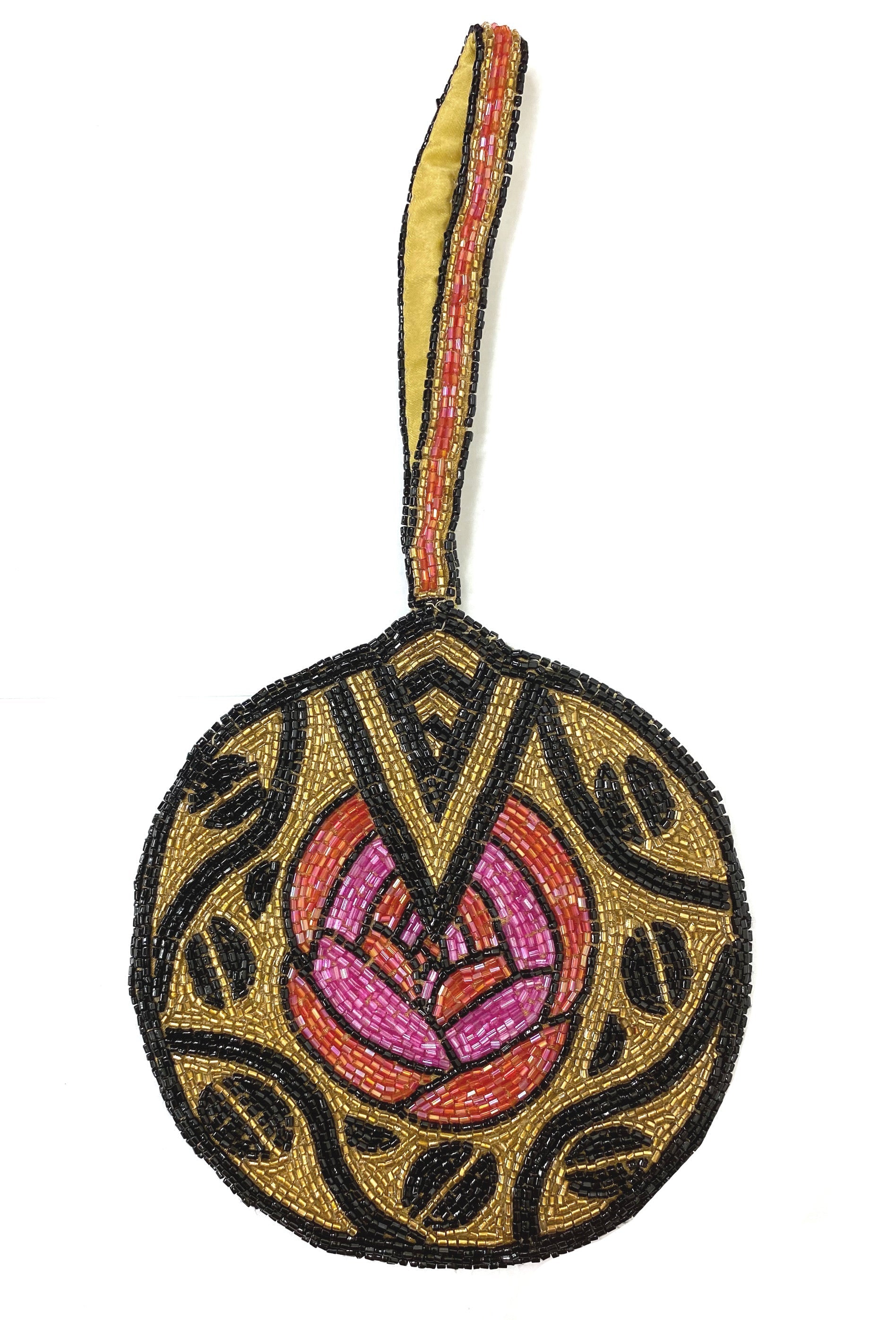 1920's Hand Beaded Wristlet Evening Purse - Deco Rose - Gold