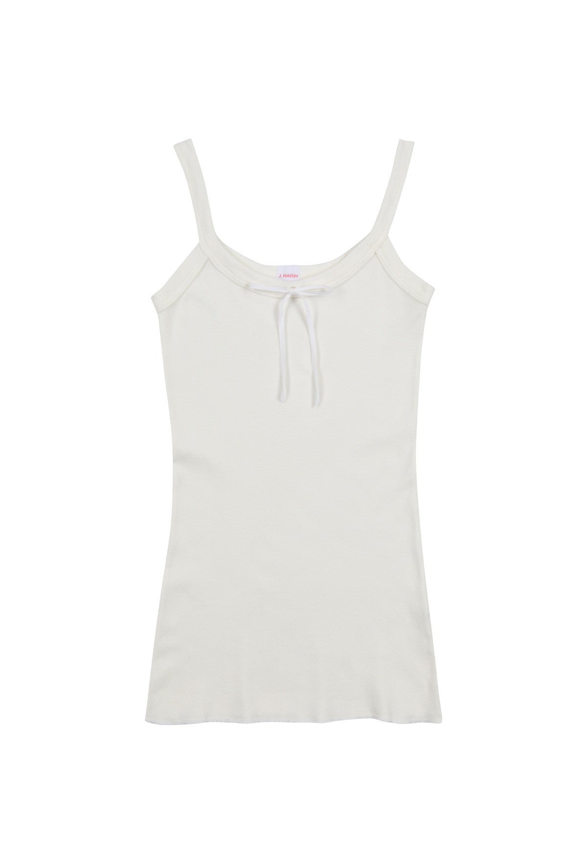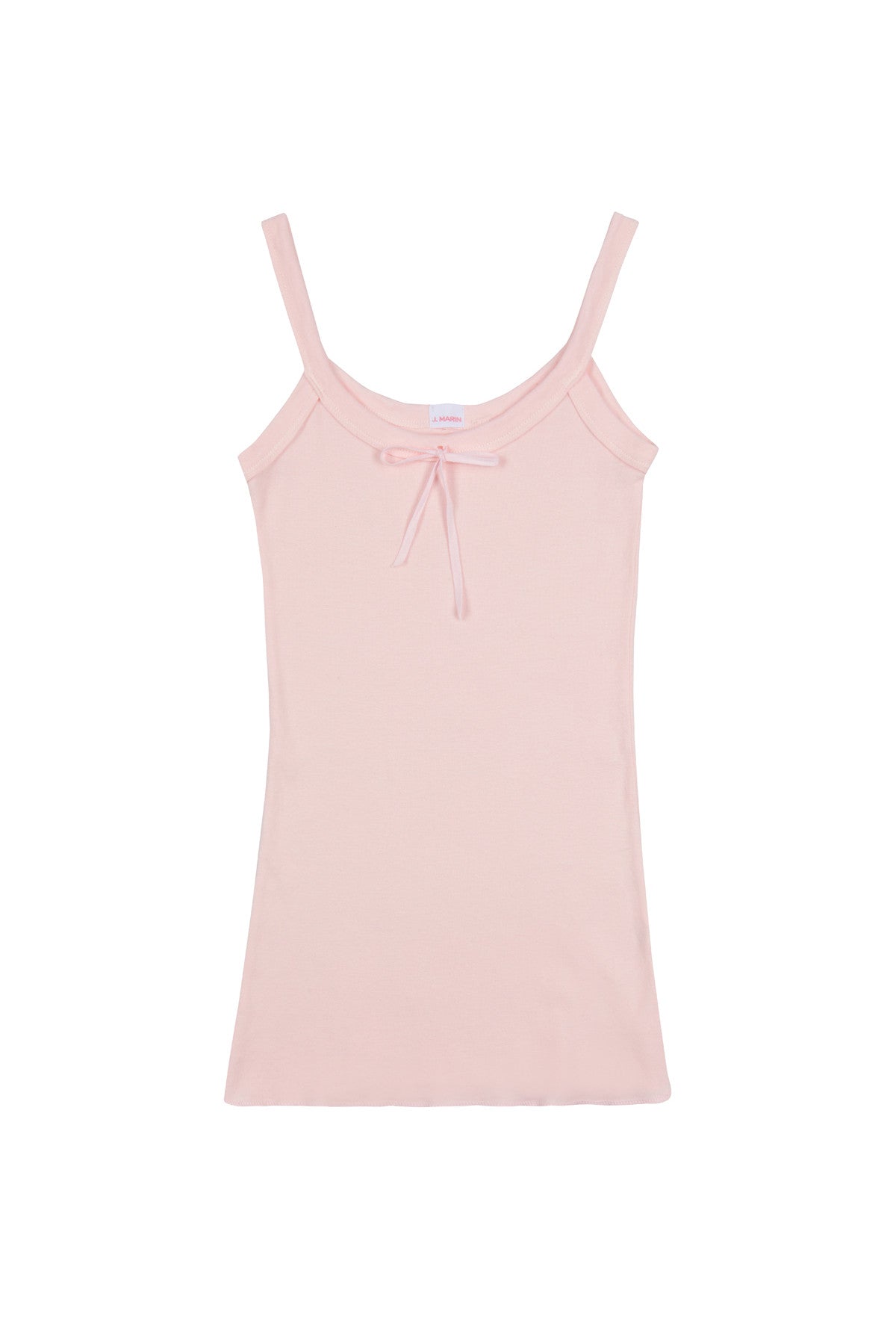 Made from USA-milled organic cotton 1x1 rib, it features delicate spaghetti straps, a gentle scoop neckline, and a flattering, fitted shape with natural stretch. A charming twill drawstring threads through the shoulders and ties into a sweet bow—left uncut for a customizable fit and vintage authenticity (see photo).