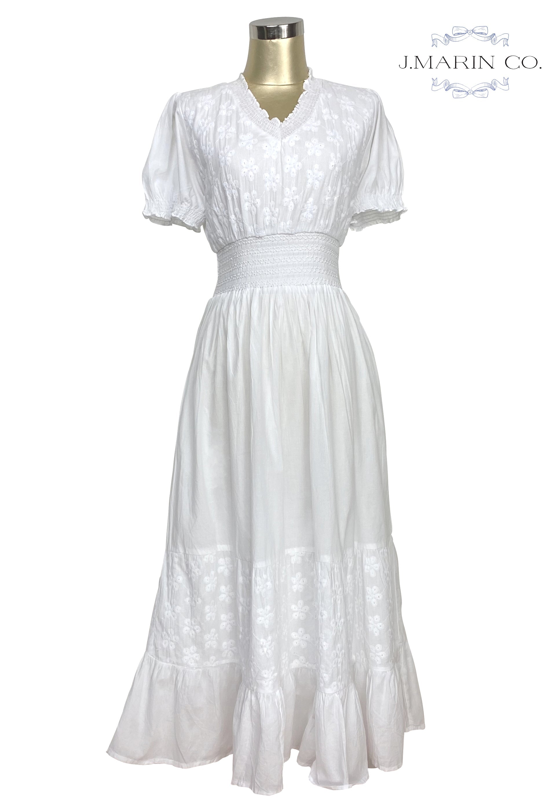 The dress features romantic puffed sleeves and smocking at the waist (both with elastic), a delicate v neckline, and ruffle trim.